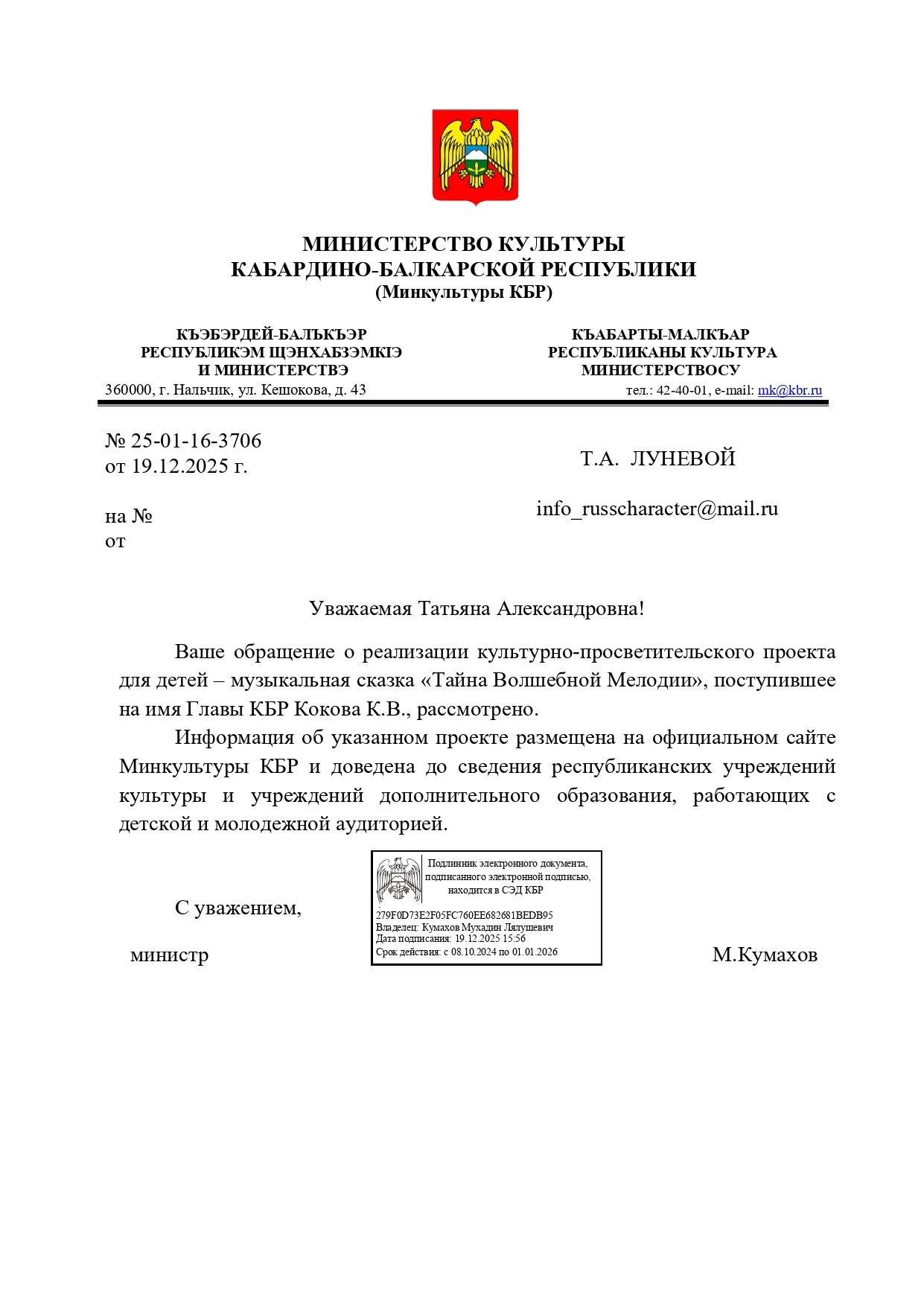 Ваше обращение о реализации культурно-просветительского проекта для детей – музыкальная сказка «Тайна Волшебной Мелодии», поступившее на имя Главы КБР Кокова К.В., рассмотрено. Информация об указанном проекте размещена на официальном сайте Минкультуры КБР и доведена до сведения республиканских учреждений культуры и учреждений дополнительного образования, работающих с детской и молодежной аудиторией.